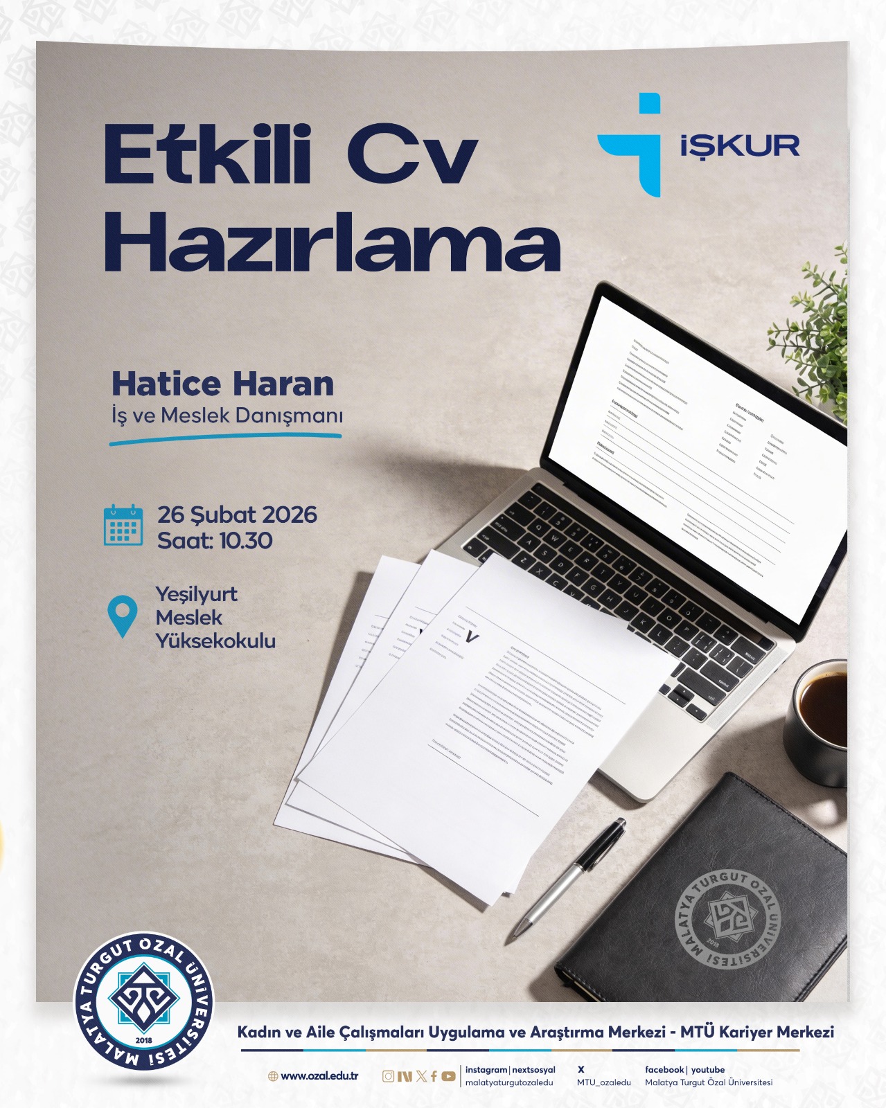 Kadın ve Aile Çalışmaları Uygulama ve Araştırma Merkezi ile MTÜ Kariyer Merkezi iş birliğinde, İŞKUR İş ve Meslek Danışmanı tarafından “Etkili CV Hazırlama” eğitimi Yeşilyurt Meslek Yüksekokulu’nda gerçekleştirildi. 📌 Eğitimde; • CV hazırlarken dikkat edilmesi gereken temel noktalar, • İşverenlerin özgeçmişte öncelikli olarak değerlendirdiği kriterler, • ...