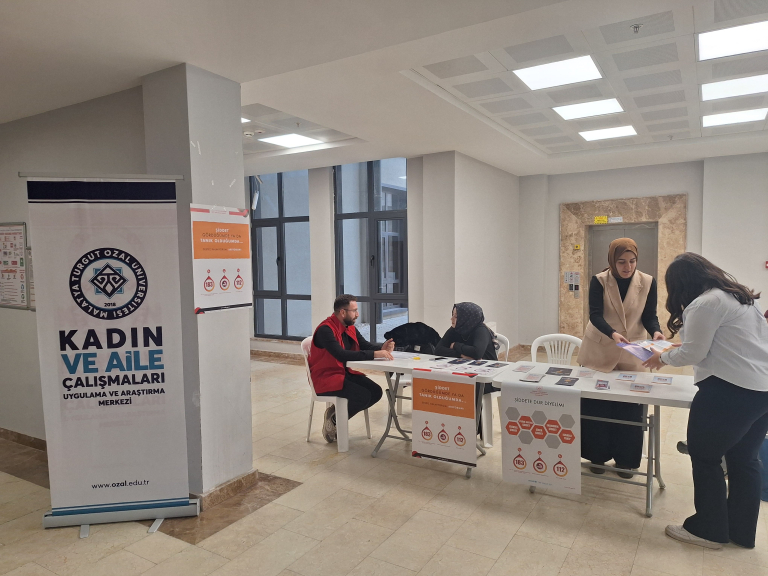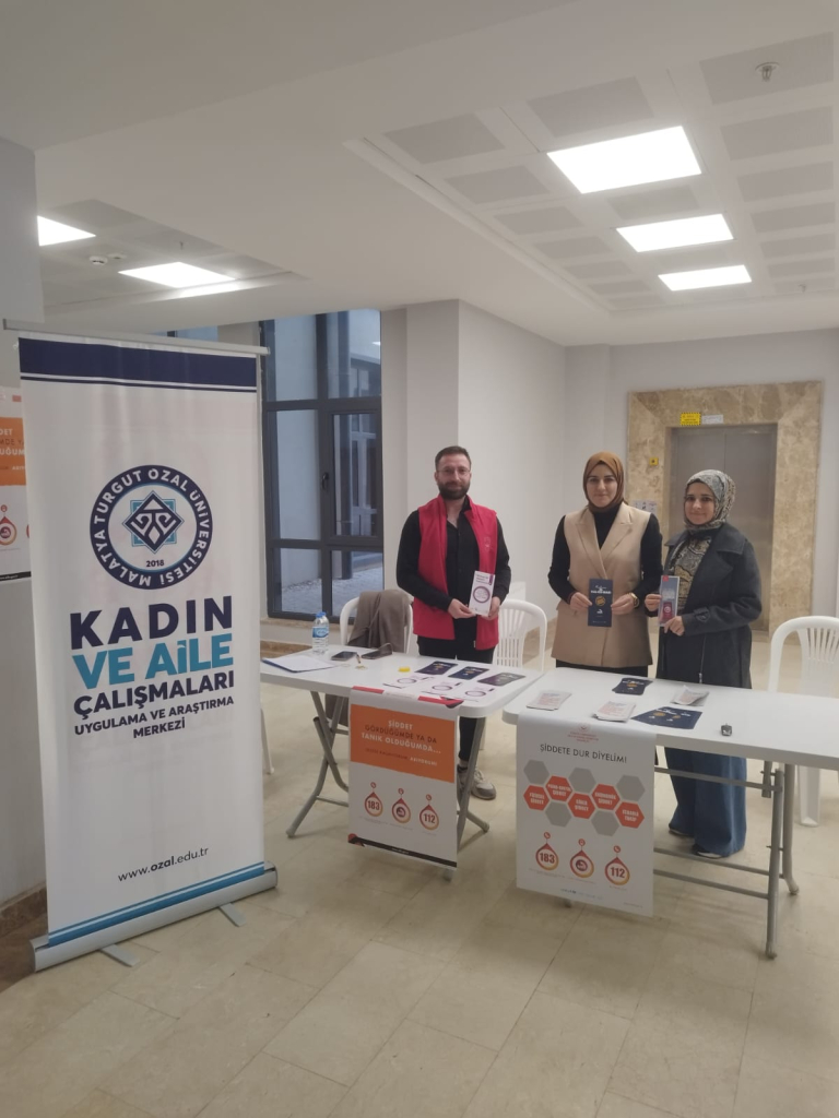 Malatya Turgut Özal Üniversitesi Kadın ve Aile Çalışmaları Uygulama ve Araştırma Merkezi (MATUKAM) ve Malatya İl Müftülüğü Aile ve Sosyal Hizmetler Müdürlüğü işbirliğiyle, kadına yönelik şiddete dikkat çekmek ve öğrencilerde toplumsal duyarlılığı artırmak amacıyla kampüsümüzde Farkındalık Standı kuruldu.